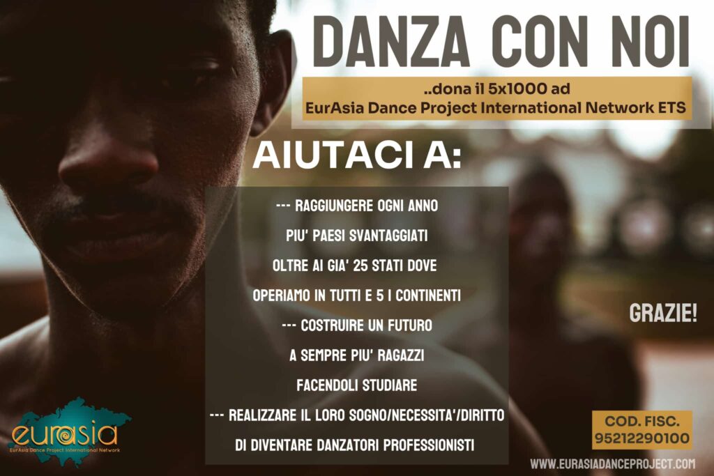 This year on the occasion of your income tax declaration, personal and/or of your institution (society/association/agency etc.), donate your 5×1000 to EurAsia Dance Project International Network – ETS using this fiscal code: